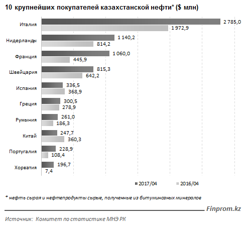 Также достаточно существенно упал экспорт в Испанию и Японию. Продажа нефти в Испанию уменьшилась за год на 512,4 тысячи тонн, или на 38,6%. При этом страна занимает 5-е место среди крупнейших импортеров казахстанской нефти.