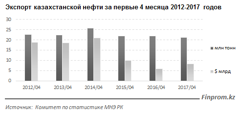Благодаря росту цен на энергоресурсы, в денежном выражении сокращение было не столь драматичным - по сравнению с суммой за январь-апрель 2016 года экспорт уменьшился на 31%, или на $112,6 миллиона.